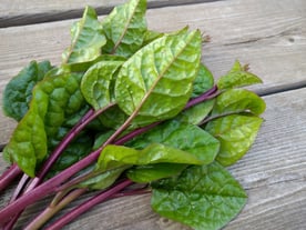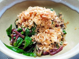 右:ツルムラサキを茹でて、鰹節をかけました。