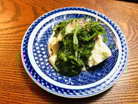 右:冷たい豆腐(冷奴)の上に、茹でたモロヘイヤを乗せて食べると元気が出そうです。