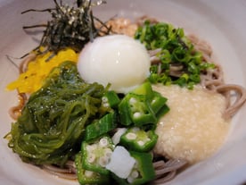左:冷たいそばの上にオクラなどの「ネバネバ野菜」を乗せてツルンとのど越しさわやかです。