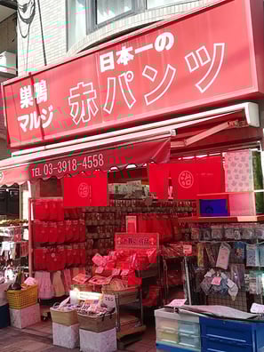 巣鴨駅の近くに巣鴨地蔵通商店街の中に赤色のアンダーウェアを販売している店がたくさんあります。